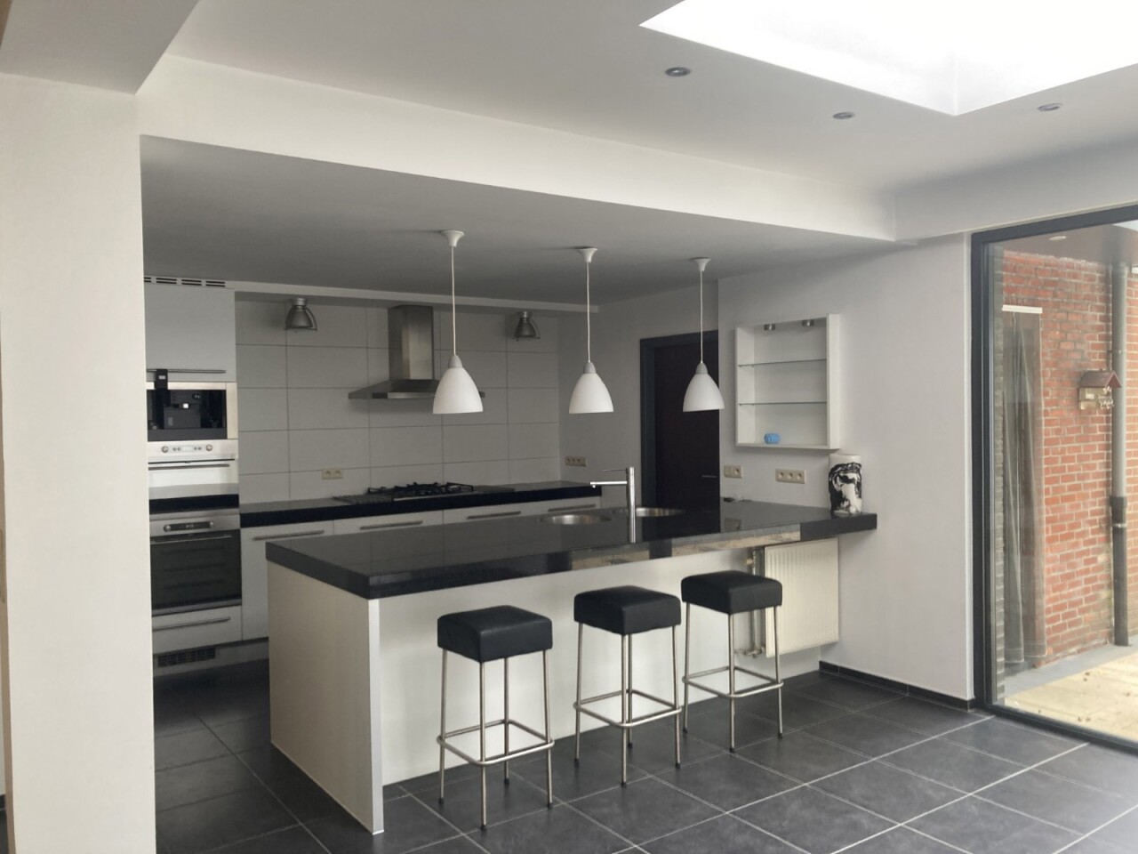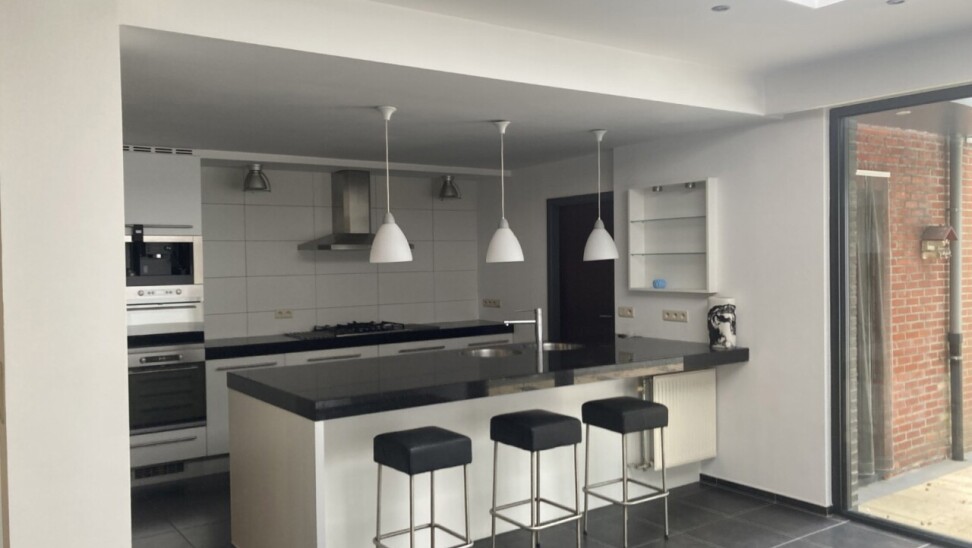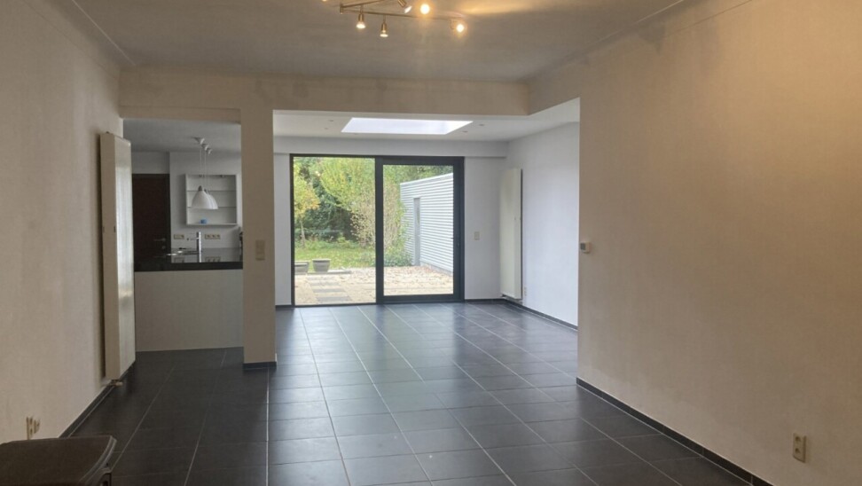 -Woonkamer met stenen vloer en open ingerichte keuken
